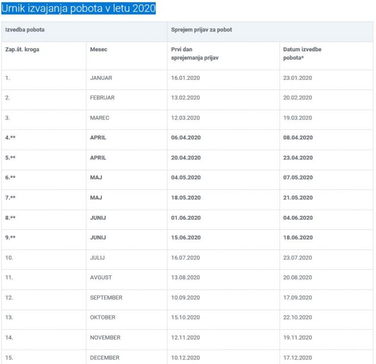 UDELEŽBA V OBVEZNEM POBOTU JE POGOJ ZA PRIDOBITEV KREDITA S POROŠTVOM DRŽAVE Na podlagi sprejetih interventnih ukrepov lahko pri bankah in hranilnicah zaprosite za odobritev likvidnostnega kredita s poroštvom države. Med pogoji za prevzem poroštva države sta tudi: kreditojemalec mora biti vključen v sistem obveznega večstranskega pobota AJPES, kreditojemalec mora imeti na dan vloge poravnane vse zapadle obveznosti iz naslova prispevkov, davkov in drugih dajatev. Informacije, kako prijavite zapadle obveznosti v obvezni pobot, najdete v naših januarskih novicah. Naslednji obvezni pobot je 18.5.2020.
