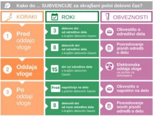 Zakon o interventnih ukrepih za pripravo na drugi val COVID-19 (ZIUPDV), ki je pričel veljati 11.7.2020, prinaša nekatere novosti pri subvenciji za skrajšani polni delovni čas, posebej glede rokov in obveznosti za delodajalce. Obveznost obveščanja o odrejenem skrajšanem delovnem času in posredovanju odredb Še naprej velja zakonska obveznost, da v 3 delovnih dneh potem, ko zaposlenim odredite delo s skrajšanim delovnim časom, o tem obvestite ZRSZ. Obvestilo posredujete ZRSZ na Portalu za delodajalce. Pri tem izberete modul Storitve > Skrajšani delovni čas > zavihek Posredovanje dokumentacije > Obvestilo o pričetku skrajšanega časa. Obvestilo, ki ga pripravite v .pdf obliki, naj vsebuje naslednje podatke: naziv in MŠO delodajalca, število zaposlenih, ki jim je bilo odrejeno delo s skrajšanim delovnim časom, datum odreditve takšnega dela. Dokazilo o poslanem obvestilu je obvezna priloga k vlogi za dodelitev subvencije Novi zakon uvaja obveznost, da ZRSZ v 8 delovnih dneh od odreditve dela s skrajšanim delovnim časom posredujete pisne odredbe za vse zaposlene, ki jim je bilo odrejeno takšno delo. Obveznost velja za odredbe zaposlenim s skrajšanim delovnim časom od 11. 7. 2020. Pisne odredbe v skenirani obliki posredujete ZRSZ na Portalu za delodajalce. Pri tem izberete modul Storitve > Skrajšani delovni čas > zavihek Posredovanje dokumentacije > Odredbe. Oddaja vloge v 15 dneh od odreditve Vloga za subvencijo je pravočasno predložena v 15 dneh od odreditve dela s skrajšanim delovnim časom, ko zaposleni nastopi takšno delo. Vlogo oddate elektronsko na Portalu za delodajalce. Pri tem izberete modul Storitve > Skrajšani delovni čas > zavihek Oddaja vloge. V skenirani obliki priložite tudi obvestilo, ki ste ga poslali v 3 delovnih dneh od odreditve dela s skrajšanim delovnim časom. Dokazilo o poslanem obvestilu je obvezna priloga k vlogi za dodelitev subvencije. Sporočanje sprememb za zaposlene po oddaji vloge za skrajšani delovni čas Če zaposlenega, za katerega uveljavljate subvencijo za skrajšani delovni čas, pozovete k opravljanju dela s polnim delovnim časom, morate ZRSZ o tem odslej predhodno obvestiti. To pomeni, da pred začetkom dela s polnim delovnim časom posredujete obvestilo ZRSZ na Portalu za delodajalce. Pri tem izberete modul Storitve > Skrajšani delovni čas > zavihek Posredovanje dokumentacije > Poziv za polni delovni čas. Obvestilo, ki ga pripravite in v obliki datoteke .pdf naložite na portal, naj vsebuje naslednje podatke: naziv in MŠO delodajalca, DLV – delovodno številko vloge, ime, priimek in EMŠO zaposlenega ter datum nastopa dela s polnim delovnim časom. Če zaposlenemu, za katerega uveljavljate subvencijo, izdate novo odredbo o skrajšanem delovnem času, jo posredujete ZRSZ v 8 delovnih dneh od odreditve. Vse odredbe v skenirani obliki posredujete ZRSZ na Portalu za delodajalce. Pri tem izberete modul Storitve > Skrajšani delovni čas > zavihek Posredovanje dokumentacije > Spremembe odredb.
