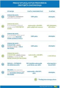 Zaradi epidemije koronavirusa se delodajalci srečujejo z odsotnostjo delavcev, ki so morali ostati doma zaradi varstva otrok ali pa celo v karanteni. Po drugi strani pa se posledice močno odražajo tudi v njihovi gospodarski aktivnosti, zlasti v panogah turizma, gostinstva, trgovine in v predelovalnih dejavnostih, v katerih se je zmanjšala potreba po delavcih. Glede na aktualno dogajanje v zvezi s širitvijo koronavirusa, vam predstavljamo možne situacije, ki jih predvideva obstoječa delovnopravna zakonodaja. Spodaj pa najdete tudi link do spletne strani Vlade RS, kjer imate vse možnosti podrobneje opisane. https://www.gov.si/novice/2020-03-13-pravice-in-obveznosti-iz-delovnega-razmerja-v-casu-posebnih-okoliscin/ Odsotnost z dela zaradi varstva otrok ob zaprtju vrtcev in šol Z današnjim dnem so se zaprli vsi vrtci in šole v državi. V času epidemije bo organizirano le nujno varstvo otrok staršev, ki morajo opravljati delovno obveznost na delovnem mestu v sektorjih kritične infrastrukture ali na področju nacionalne varnosti. Delavec (eden od staršev) je v takšnem primeru upravičen do odsotnosti z dela. Delavec je upravičen do odsotnosti, če gre za otroka do 5. razreda osnovne šole in če nima možnosti zagotovitve varstva s strani drugega starša ali na drug ustrezen način. V tej situaciji si delodajalec in delavec tveganje delita, saj j znaša nadomestilo 50% plače oziroma najmanj 70% minimalne plače. Odsotnost z dela zaradi odrejene karantene V primeru karantene, ki jo z odločbo odredi zdravi osebi minister za zdravje na predlog NIJZ, gre za osebe, ki so bile v tesnem kontaktu z okuženimi in se obravnavajo kot visoko rizične npr. družinski člani, ki živijo v skupnem gospodinjstvu ali druge osebe po presoji epidemiologa. Navedene osebe ne bodo mogle priti na delo, lahko pa bodo opravljale delo na domu. Če bo oseba v karanteni opravljala delo na domu, ji bo pripadala celotna plača. Če oseba v karanteni ne more opravljati dela na domu, pa bo upravičena do nadomestila plače v višini 80% plače. Delodajalec bo lahko uveljavil povračilo teh nadomestil plač v skladu z Zakonom o interventnem ukrepu delnega povračila nadomestila plače (ko bo sprejet in uveljavljen). Povračilo mu bo pripadalo le, če za navedeno osebo ni mogel organizirati dela na domu. Odsotnost z dela zdrave osebe, ki po dogovoru z delodajalcem ostane doma Za osebe, ki so zdrave in se lahko prosto gibljejo (niso v karanteni), niso potrebni posebni ukrepi. Te osebe so lahko normalno vključene v delovni kolektiv in ne potrebujejo domače samoizolacije. Če pa delodajalec želi, da delavec ne pride na delo, je delavec upravičen do nadomestila v breme delodajalca v višini polne plače. Zaradi epidemije pa lahko delodajalec odredi delavcem delo na domu. Delavec je v tem primeru upravičen do polne plače (in nadomestila za uporabo lastnih sredstev), delodajalec pa prihrani (najmanj) pri izplačilu stroškov za prevoz na delo in z dela. Takšno delo je načeloma mogoče odrediti samo zaposlenim, ki opravljajo dela, povezana z uporabo računalnika in telefona. Če se boste odločili za to možnost, priporočamo sprejem pravilnika o delu na domu. Odsotnost z dela zbolele oziroma okužene osebe V primeru izolacije, ki jo zboleli osebi odredi zdravnik, imajo delavci pravico do začasne zadržanosti od dela. Nadomestila plače gre od 1. dne dalje v breme obveznega zdravstvenega zavarovanja v višini 90% od osnove. Bolniški list izda osebni zdravnik, pri čemer se kot razlog določi »izolacija«. Izolacija se lahko izvaja v bolnišnici ali doma. V primeru bolezni, ko ne gre za izolacijo, se nadomestilo plače izplača v breme delodajalca do 31. delovnega dne zadržanosti od dela, v breme obveznega zdravstvenega zavarovanja pa od 31. delovnega dne zadržanosti od dela dalje. Odsotnost delavcev zaradi začasnega čakanja na delo doma Za čas nezagotavljanja dela delavcem zaradi padca obsega dela, zmanjšanja prihodkov lahko delodajalec delavca napoti na začasno čakanje na delo doma. Delodajalec lahko ta ukrep izvaja zgolj 6 mesecev v posameznem koledarskem letu in le, če je ukrep namenjen ohranitvi zaposlitev. V tem primeru ima delavec pravico do nadomestila plače v višini 80 % povprečne plače zadnjih 3 mesecev. Delodajalec bo lahko uveljavil delno povračilo nadomestil plač v skladu z Zakonom o interventnem ukrepu delnega povračila nadomestila plače (ko bo sprejet in uveljavljen). V navedenem predlogu zakona bo država priskočila na pomoč delodajalcem, ki zaradi slabega poslovnega položaja ne bodo mogli zagotavljati dela hkrati najmanj 30 % zaposlenim delavcem in jih bo zato napotil na začasno čakanje na delo. Država naj bi povrnila 40 odstotkov nadomestila za čakanje na delo. Delodajalec bo lahko pravico do povračila izplačanih nadomestil plače uveljavljal samo enkrat in največ za obdobje treh mesecev.